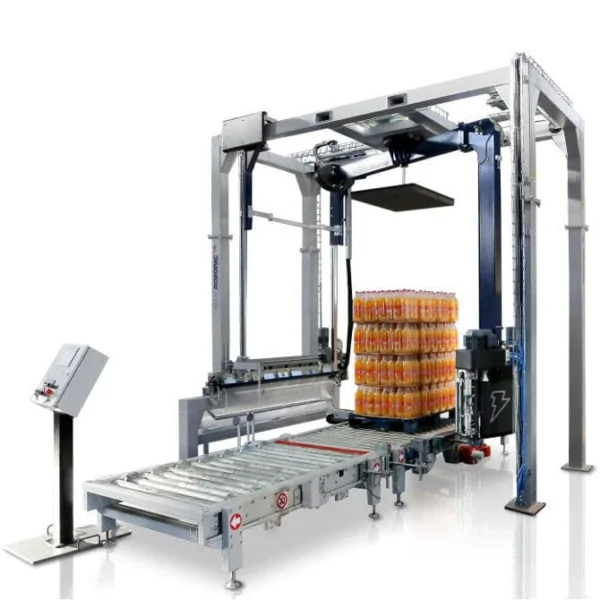 Automatic machine with rotating arm to wrap palletized loads with stretch film, especially indicated for use in industries where high production rates are required and for light, easily deformable and unstable products.